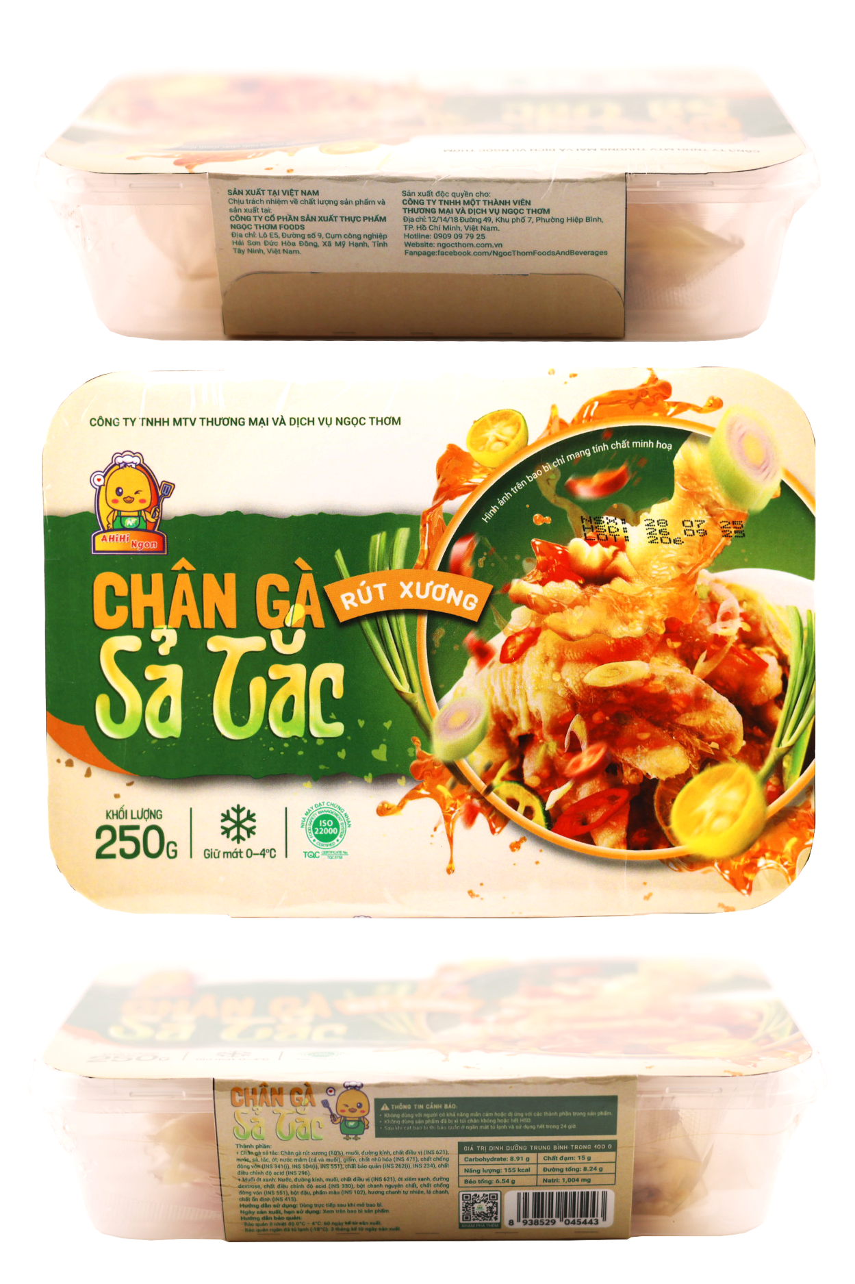 + Chân gà sả tắc: Chân gà rút xương (80%), muối, đường kính, chất điều vị (INS 621), nước, sả, tắc, ớt, nước mắm (cá và muối), giấm, chất nhũ hóa (INS 471), chất chống đông vón (INS 341(i), INS 504(i), INS 551), chất bảo quản (INS 262(i), INS 234), chất điều chỉnh độ acid (INS 296).